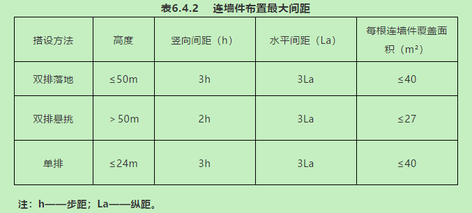 6.4.2 腳手架連墻件數(shù)量的設(shè)置除應(yīng)滿足本規(guī)范的計(jì)算要求外,還應(yīng)符合表6.4.2的規(guī)定。