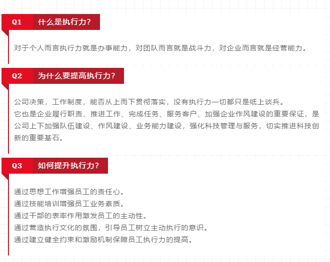 本次培訓(xùn)會以本月莫干山高層培訓(xùn)為背景,從執(zhí)行力的含義、執(zhí)行力的意義與作用、增強(qiáng)執(zhí)行力的措施、提高執(zhí)行力需要注意的幾個(gè)問題和幾個(gè)關(guān)系、執(zhí)行力口號等方面講述了“執(zhí)行力”。