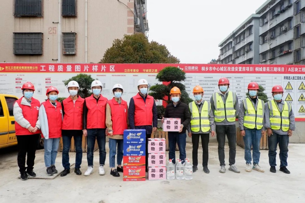 慰問小組先后來到位于市區(qū)復(fù)興南路的康涇塘西側(cè)住宅小區(qū)項目、桐鄉(xiāng)市中心城區(qū)改造安置房項目(桐城景苑三期項目)A區(qū)塊,對堅守崗位、奮戰(zhàn)一線的工友進行慰問,并送上口罩、消毒液等疫情防控慰問物資。