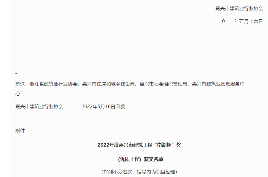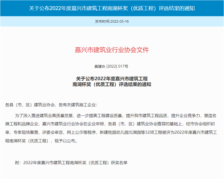 近日,經(jīng)嘉興市建筑業(yè)協(xié)會初審、專家現(xiàn)場復查、評委會審定,由我集團承建的桐鄉(xiāng)市錦程幼兒園新建項目榮獲嘉興市建筑工程“南湖杯”優(yōu)質(zhì)工程獎。